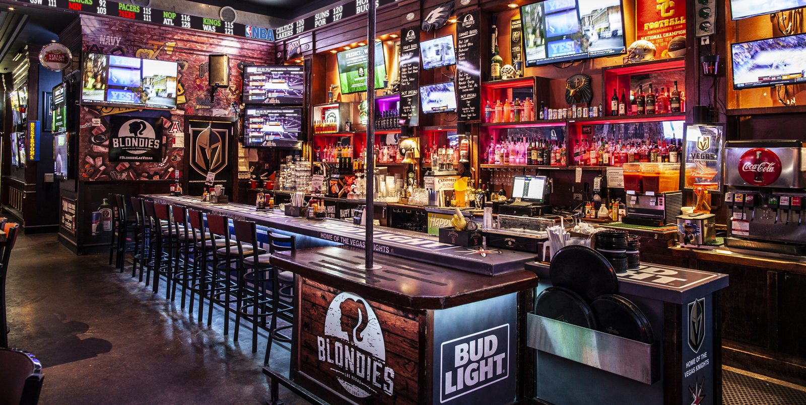 Blondies Sports Bar and Grill Las Vegas is your one stop shop for an awesome atmosphere, great service, amazing drinks, and delicious food! With over 60 big screens, ranging from 32’ to 12 Feet, no matter where you sit you’ll never miss a play! Blondies is your home away from home bar. Come in for a quick lunch and a couple of beers or spend all day and night eating, drinking and watching your favorite sports.